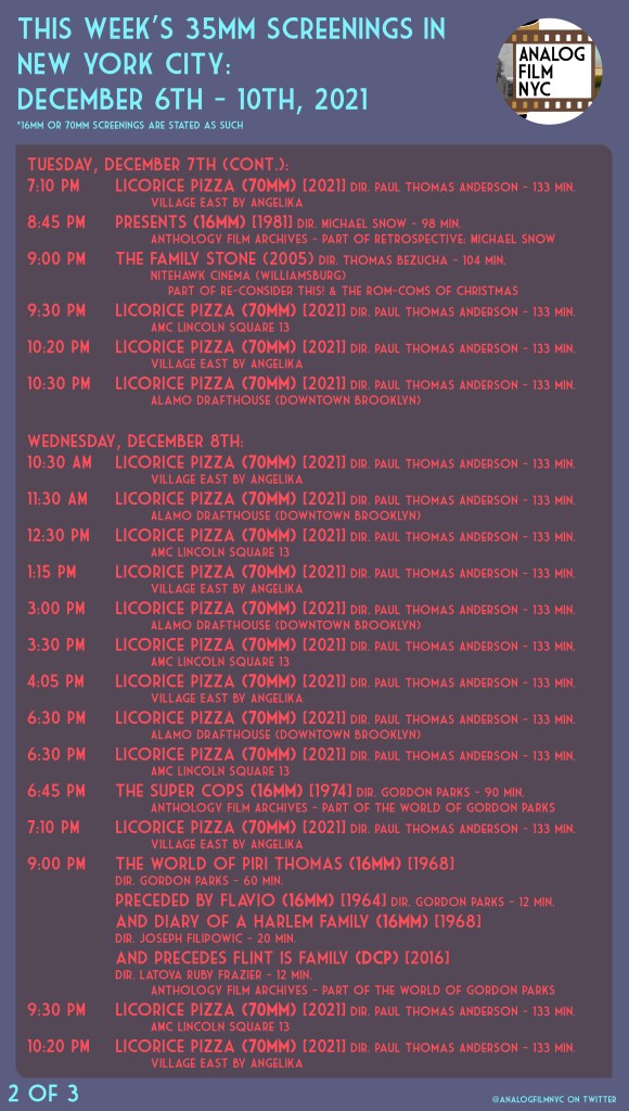 Licorice Pizza (2021) in 70mm at Alamo Drafthouse, Village East by Angelika & AMC Lincoln Square 13, The Family Stone (2005) & Trancers (1984) at Nitehawk Cinema Williamsburg and more at Film at Lincoln Center, the Roxy Cinema & Anthology Film Archives.
