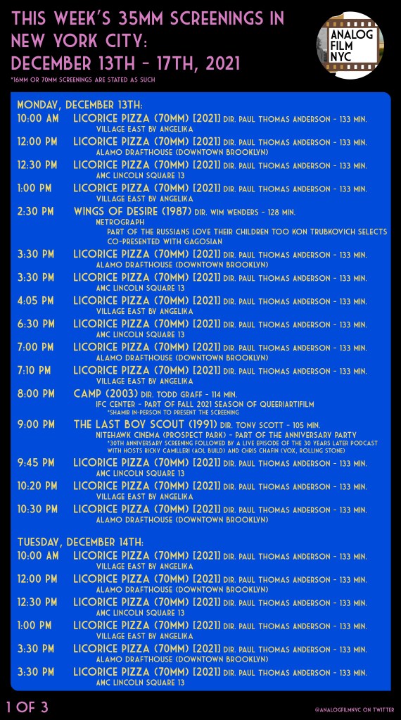 Camp (2003) with Shamir at the IFC Center, The Last Boy Scout (1991), Malice (1993) & The Preacher’s Wife (1996) at the Nitehawk Cinema, Belly (1998) at the Museum of the Moving Image & Nightmare Alley (1947) at the Roxy Cinema and more.