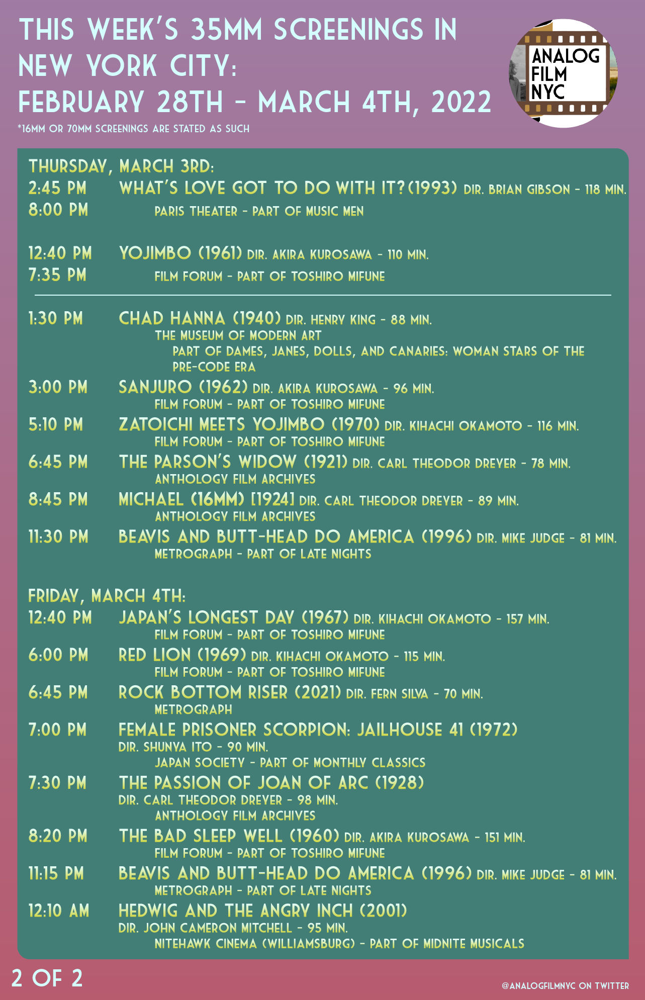 Toshirō Mifune at Film Forum, What’s Love Got to Do With It? at the Paris Theater, Chad Hanna at The Museum of Modern Art, Carl Theodor Dreyer at Anthology Film Archives & more.