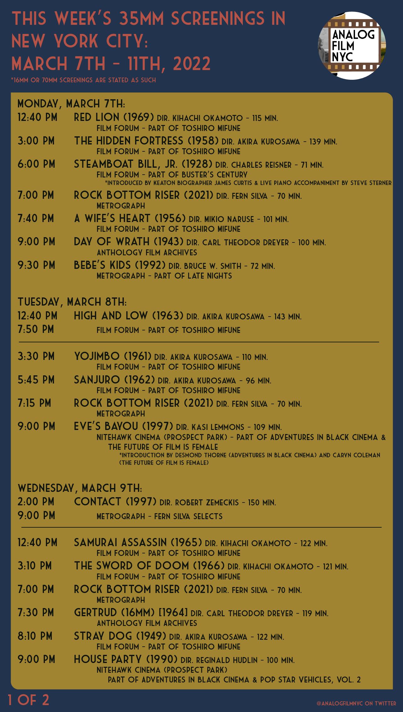 Toshirō Mifune at Film Forum, Carl Theodor Dreyer at Anthology Film Archives, Eve’s Bayou & Cool as Ice at Nitehawk Cinemas, Peter Bogdanovich at The Museum of Modern Art, Jane Campion at the Paris Theater & more.