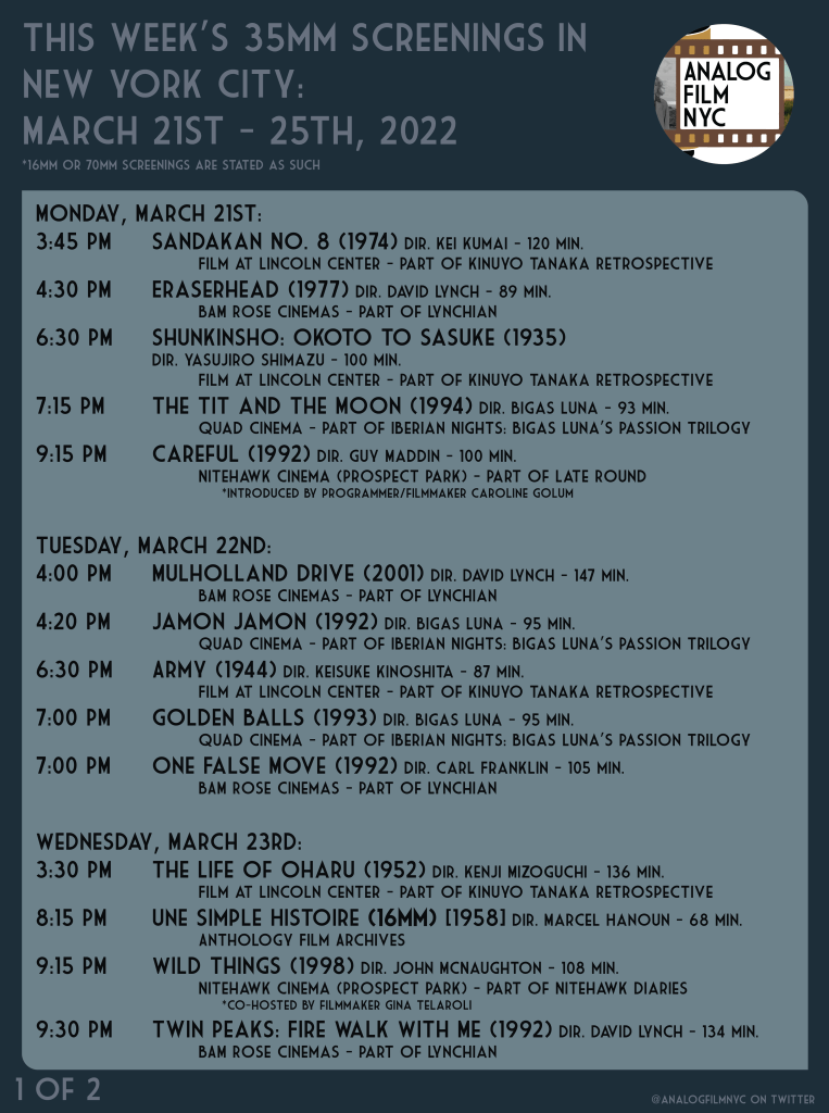 F for Fake at the Museum of the Moving Image, Kinuyo Tanaka at Film at Lincoln Center, Lynchian at BAM Rose Cinemas, Bigas Luna at the Quad Cinema, Wild Things at the Prospect Park Nitehawk Cinema, Kit Noir Film Festival at Columbia University’s Lenfest Center for the Arts & more.