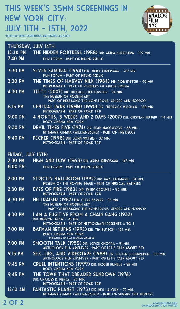 Mifune Redux & Diva at Film Forum, Sister Act 2 & Fantastic Planet at Nitehawk Cinema, Messaging the Monstrous at The Museum of Modern Art, Batman Returns & Cruel Intentions at the Roxy Cinema & more.
