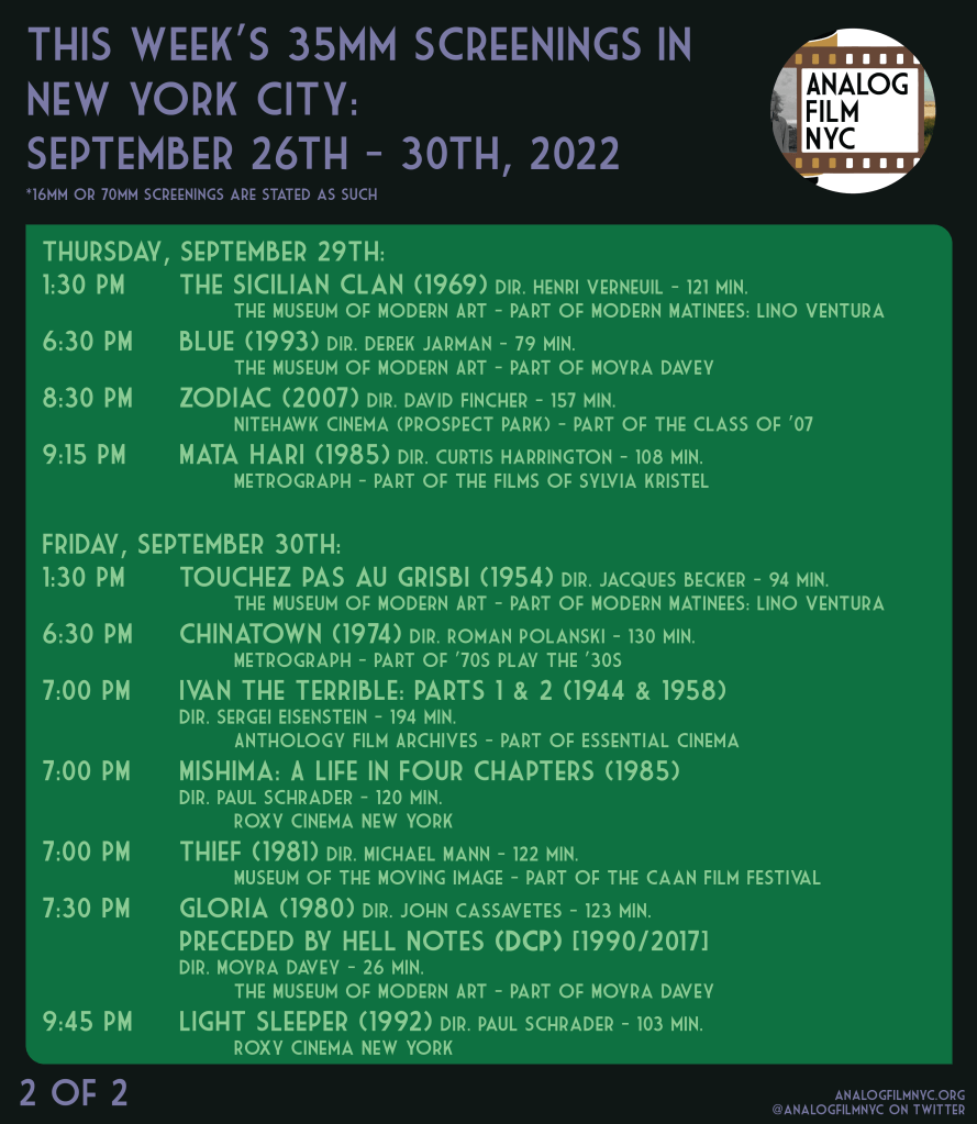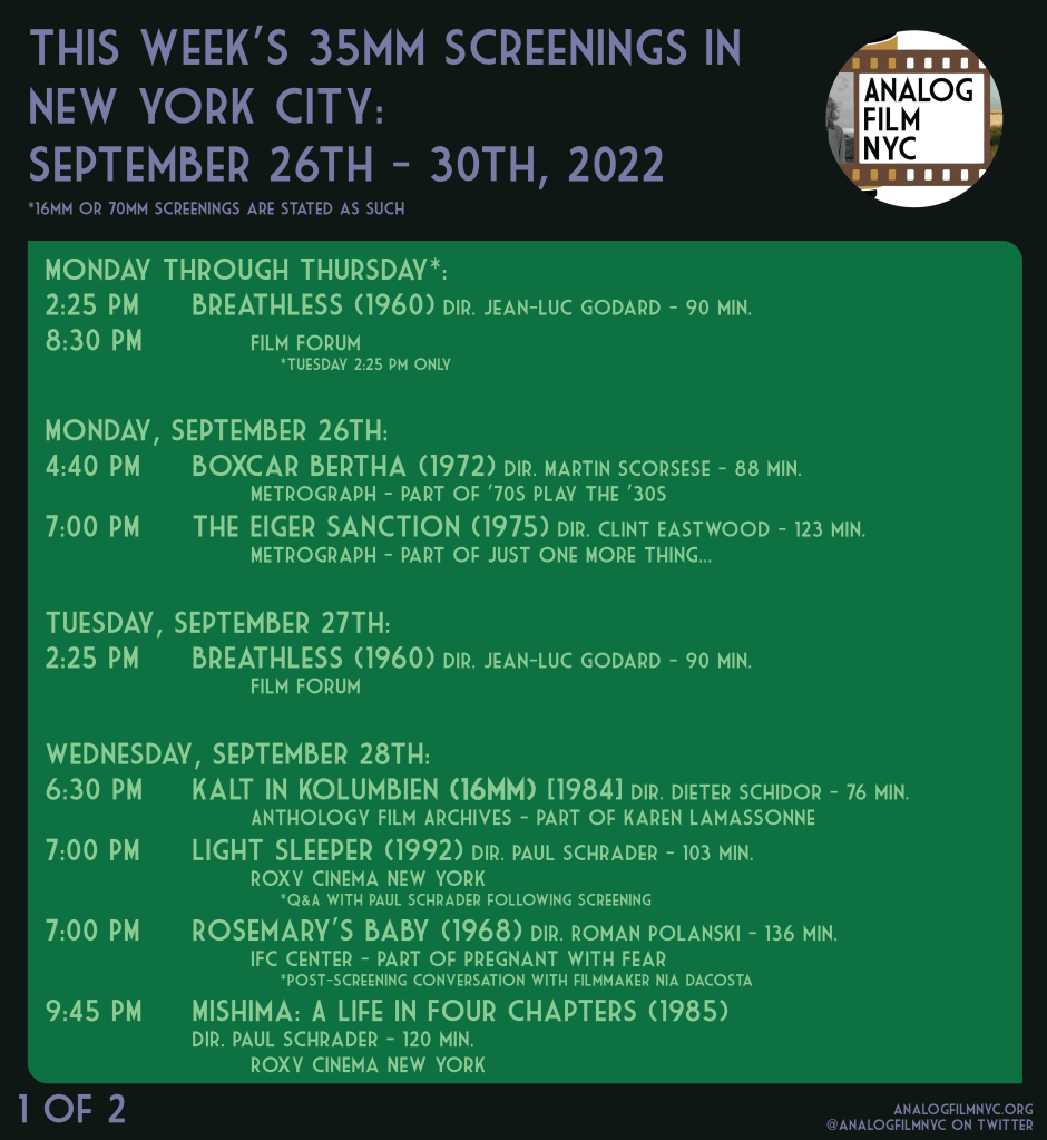 Breathless at Film Forum, Light Sleeper & Mishima at the Roxy Cinema, Rosemary’s Baby at the IFC Center, Blue (1993) at The Museum of Modern Art, Zodiac at Nitehawk Cinemas, Thief at the Museum of the Moving Image & more.