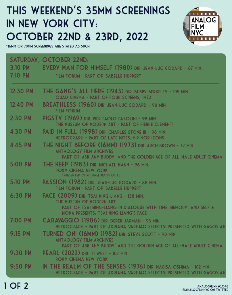 Isabelle Huppert & Breathless at Film Forum, All-Male Adult Cinema in 16mm at Anthology Film Archives, The Keep presented by Michael Mann Facts & Pearl at the Roxy Cinema, Face (2009) at The Museum of Modern Art & more.
