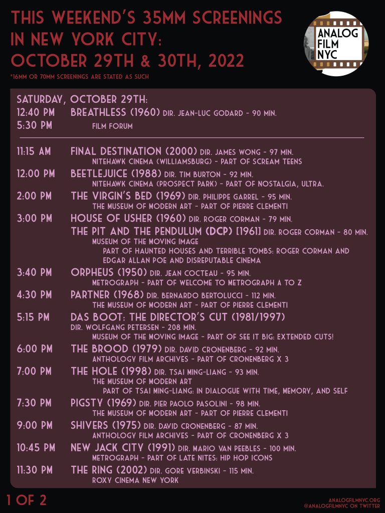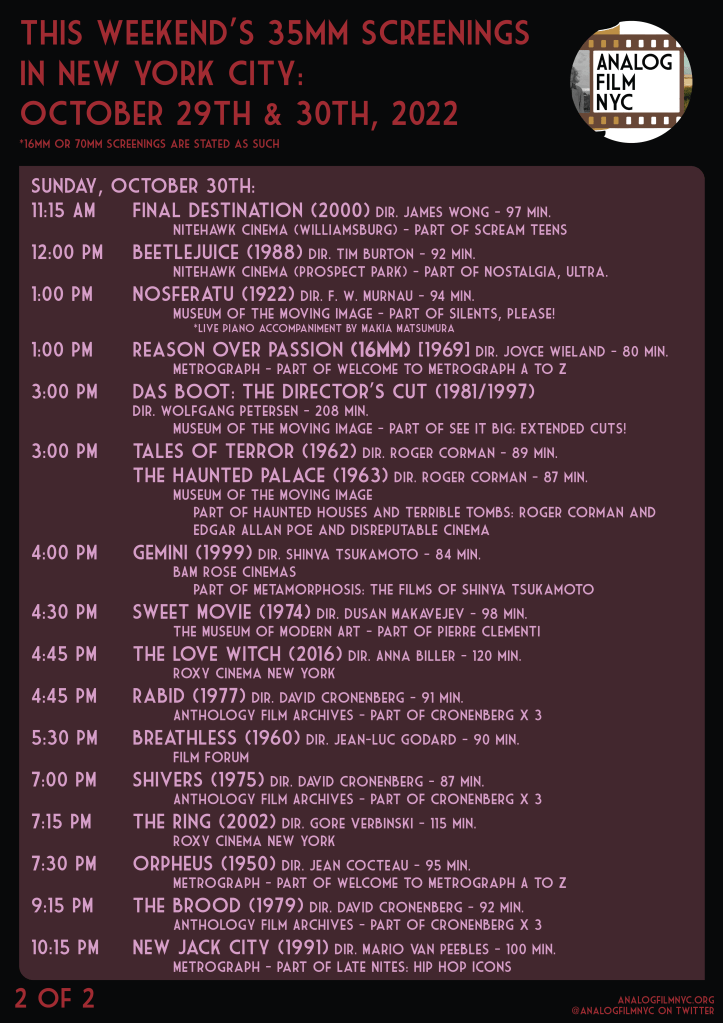 Horror at Nitehawk Cinemas, Roger Corman, Nosferatu & See It Big: Extended Cuts! at the Museum of the Moving Image, Cronenberg at Anthology Film Archives, The Ring (2002) & The Love Witch at the Roxy Cinema & more.