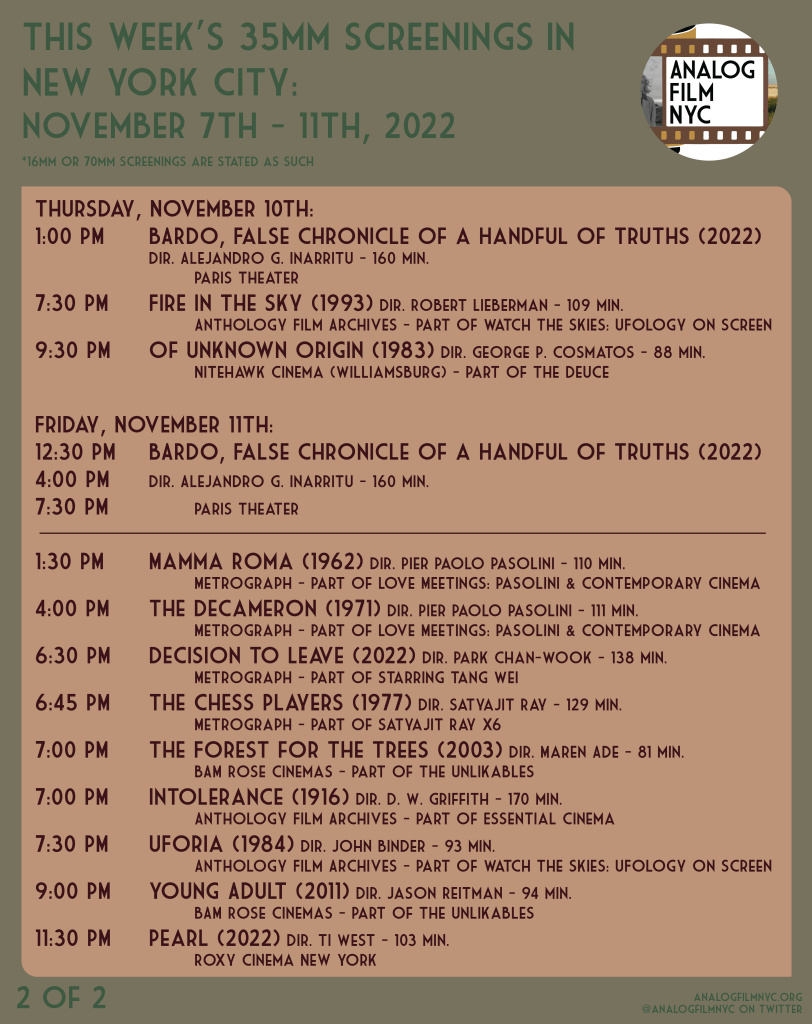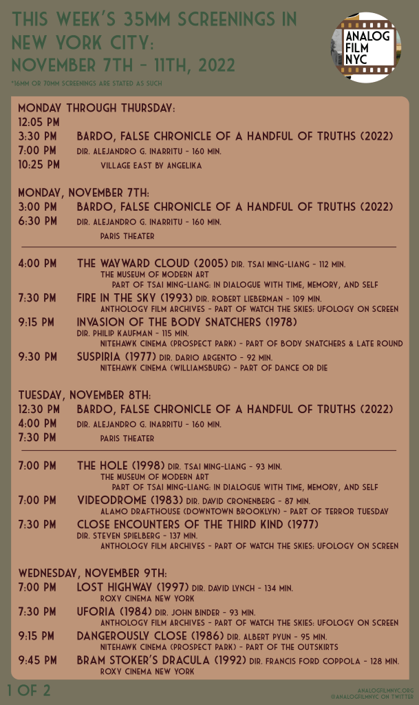 BARDO at Village East by Angelika & the Paris Theater, Tsai Ming-Liang at The Museum of Modern Art, Body Snatchers at Nitehawk Cinemas, UFOlogy at Anthology Film Archives, Pearl & Lost Highway at the Roxy Cinema & more.