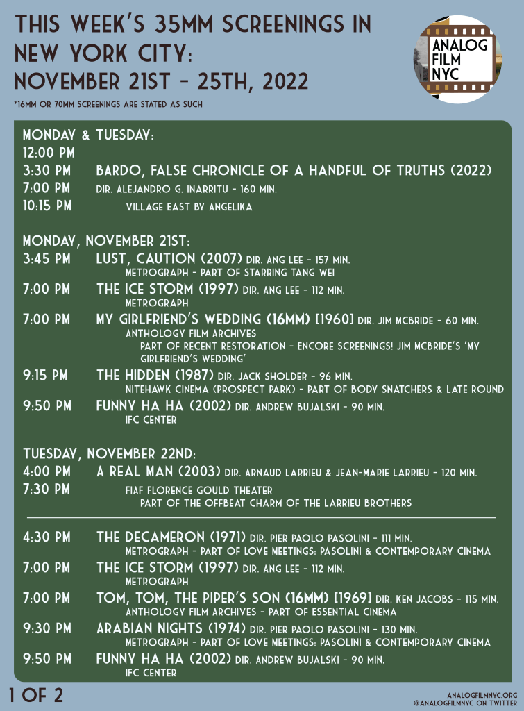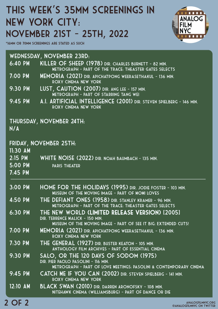 Funny Ha Ha at the IFC Center, Memoria, A.I. & Catch Me If You Can at the Roxy Cinema, Home for the Holidays & The New World at the Museum of the Moving Image, Black Swan & The Hidden at Nitehawk Cinemas & more.