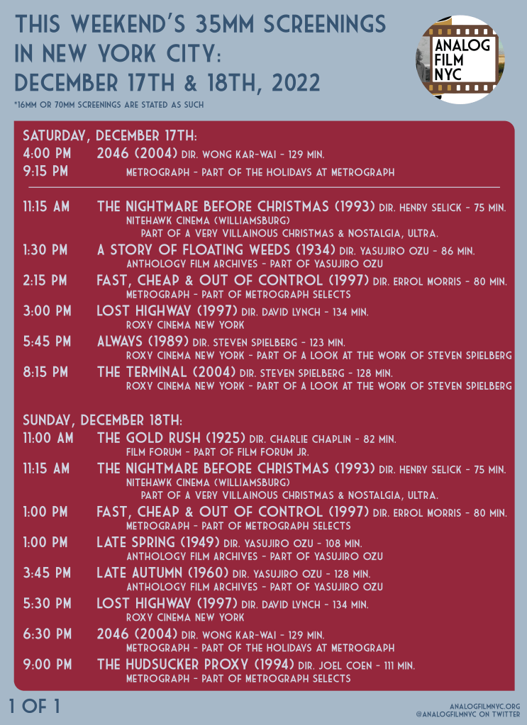 The Nightmare Before Christmas at the Williamsburg Nitehawk Cinema, Yasujiro Ozu at Anthology Film Archives, Lost Highway & Spielberg presented by TheFilmStage at the Roxy Cinema, The Gold Rush at Film Forum & more.