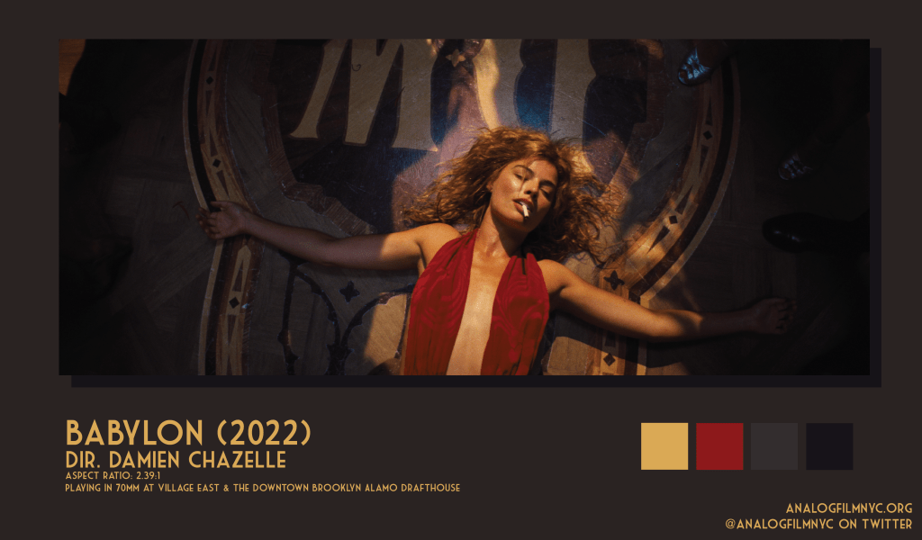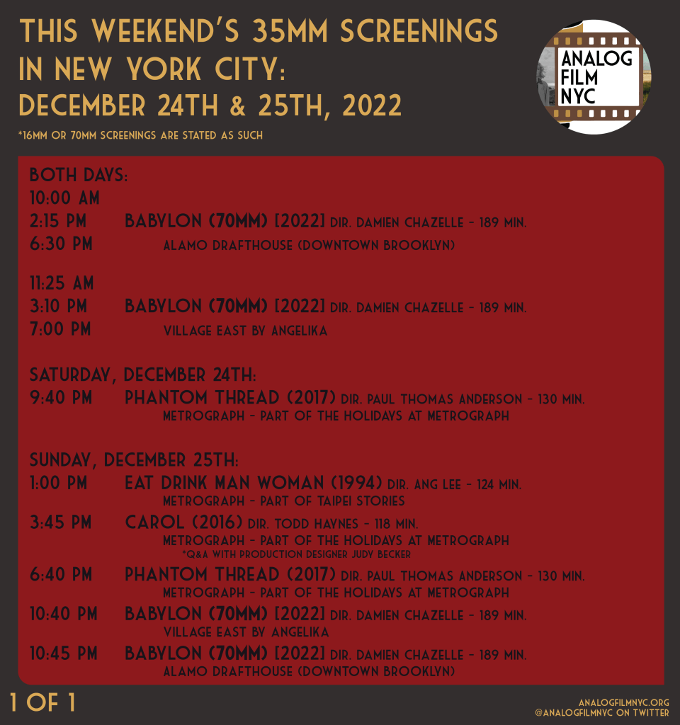 December 24th & 25th, 2022 Posted byanalogfilmnycDecember 23, 2022Posted inInfographics Babylon in 70mm at Village East by Angelika & the Downtown Brooklyn Alamo Drafthouse & more. Related