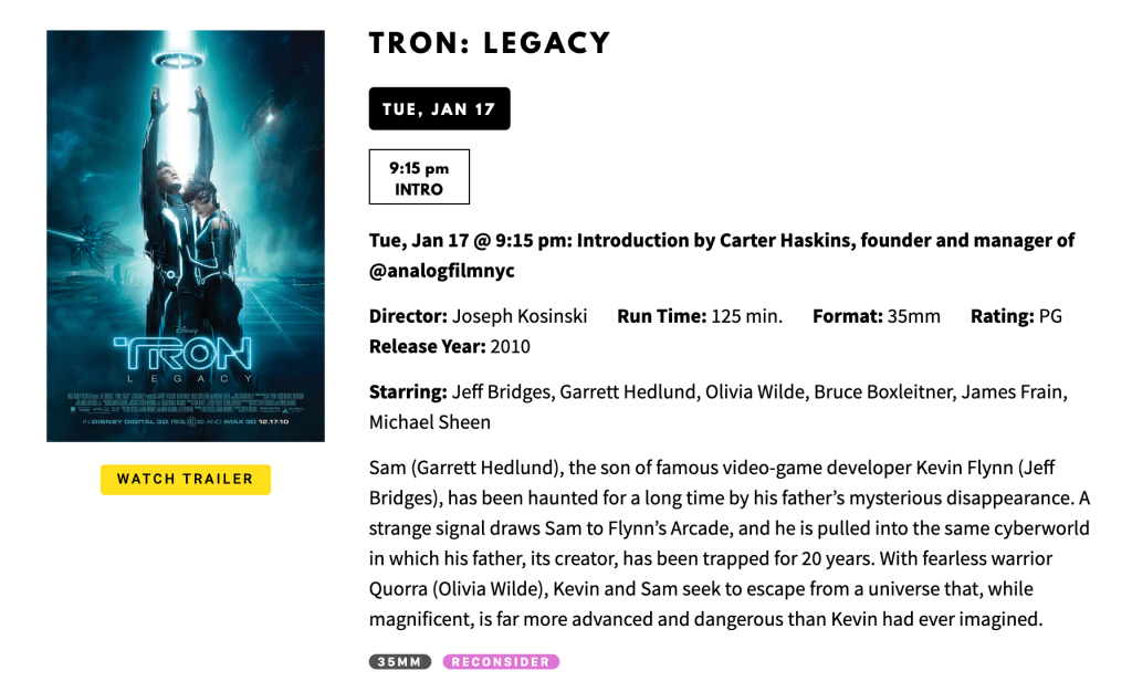 Hey everyone! I will be introducing a 35mm screening of Tron: Legacy (2010) at the Williamsburg Nitehawk Cinema on January 17th at 9:15pm. It is one of my all-time favorite movies and I’m very excited to talk about it and see it on film. It’s a rare print, so I wouldn’t miss out on the opportunity. Here is a link to the tickets!