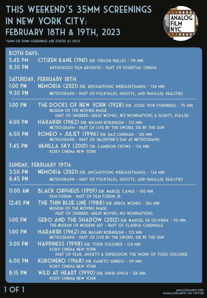 Citizen Kane at Anthology Film Archives, Snubbed at the Museum of the Moving Image, Vanilla Sky, Happiness, Kuroneko & Wild at Heart at the Roxy Cinema, Black Orpheus at Film Forum & more.