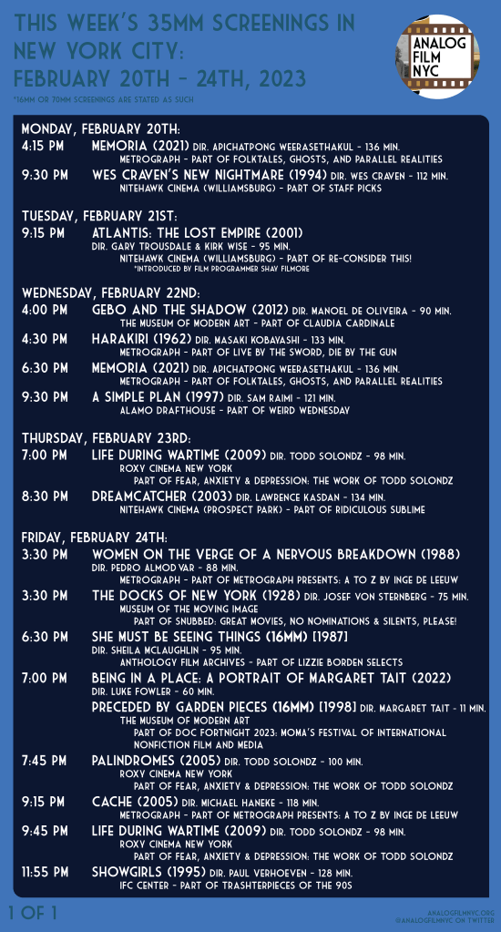 Wes Craven’s New Nightmare & Atlantis: The Lost Empire at Nitehawk Cinemas, A Simple Plan at the downtown Brooklyn Alamo Drafthouse, Todd Solondz at the Roxy Cinema, Snubbed at the Museum of the Moving Image, Showgirls at the IFC Center & more.