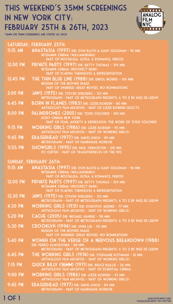 Snubbed at the Museum of the Moving Image, Lizzie Borden & Working Girl(s) at Anthology Film Archives, Todd Solondz at the Roxy Cinema, Showgirls at the IFC Center, Anastasia & Private Parts at Nitehawk Cinemas & more.
