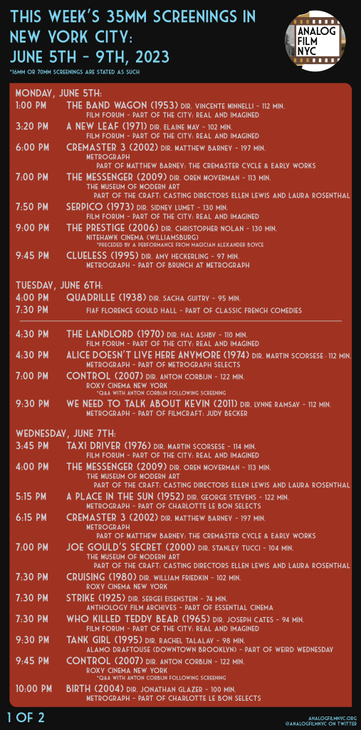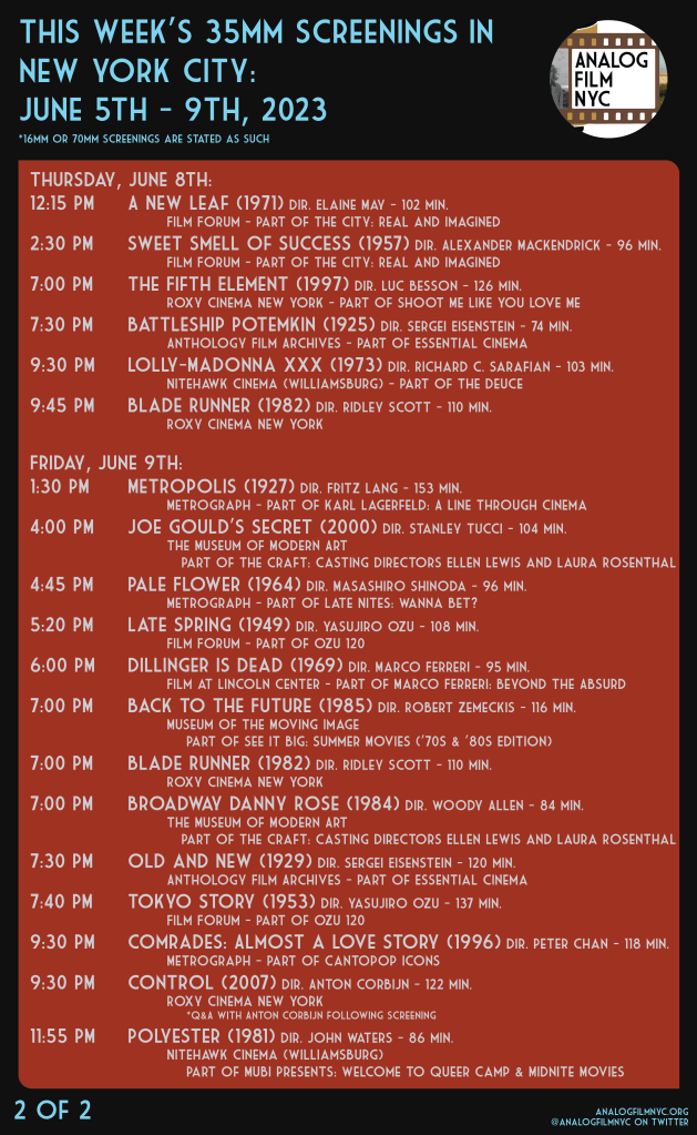The City & Ozu 120 at Film Forum, Ellen Lewis & Laura Rosenthal at The Museum of Modern Art, Control, Cruising & Blade Runner at the Roxy Cinema, Tank Girl at the Downtown Brooklyn Alamo Drafthouse, Summer Movies at the Museum of the Moving Image & more.