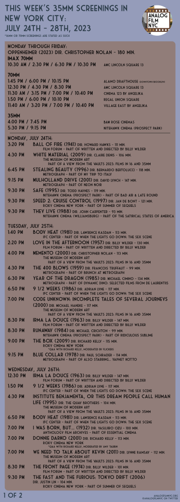 Oppenheimer at multiple venues, Billy Wilder at Film Forum, Summer of Sequels at the Roxy Cinema, The Satirical States of America at Nitehawk Cinemas & more.