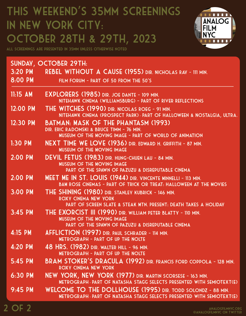 50 from the 50’s at Film Forum, Halloween at BAM Rose Cinemas, Anthology Film Archives, and the Roxy Cinema, Reverse Shot at the Museum of the Moving Image, River Reflections at Nitehawk Cinemas & more.