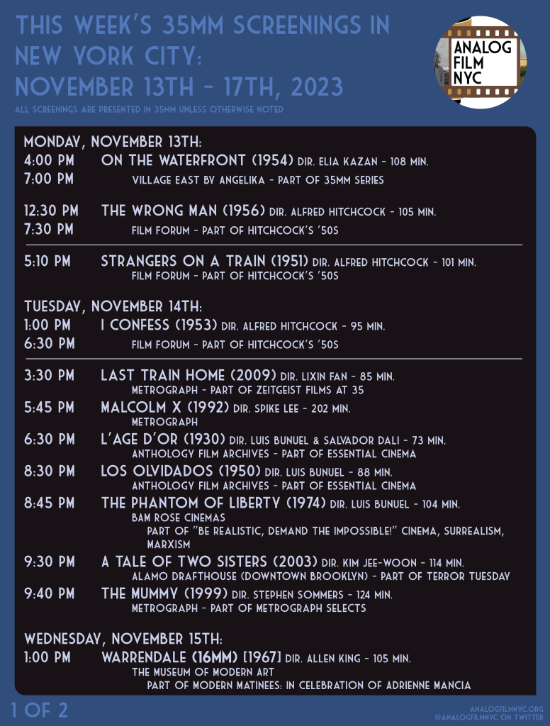 On The Waterfront at Village East by Angelika, Hitchcock’s ‘50s at Film Forum, Surrealism & Marxism at BAM Rose Cinemas, Buñuel at Anthology Film Archives, Carlito’s Way at the Museum of the Moving Image & more.