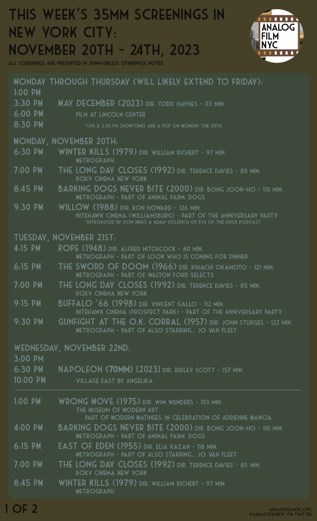 May December at Film at Lincoln Center, The Long Day Closes at the Roxy Cinema, The Anniversary Party at Nitehawk Cinemas, Napoleon in 70mm at Village East by Angelika, Hepburn & Grant at the Museum of the Moving Image & more.