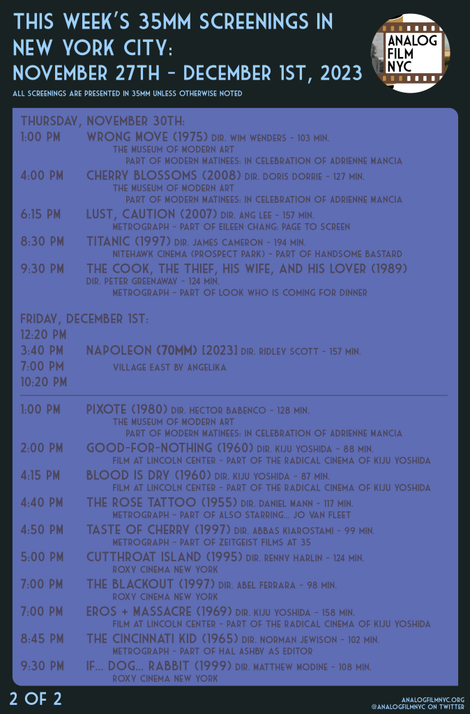 May December & Kiju Yoshida at Film at Lincoln Center, Napoleon in 70mm at Village East by Angelika, Dogtooth, Cutthroat Island & The Blackout at the Roxy Cinema, Adrienne Mancia at The Museum of Modern Art & more.