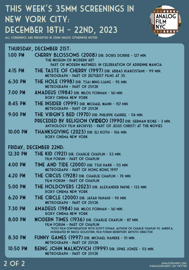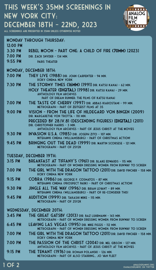 Rebel Moon in 70mm at the Paris Theater, Katsu Kanai & Jesus Christ! at the Movies at Anthology Film Archives, Christmas Action! & Re-Consider This! at Nitehawk Cinema & more.