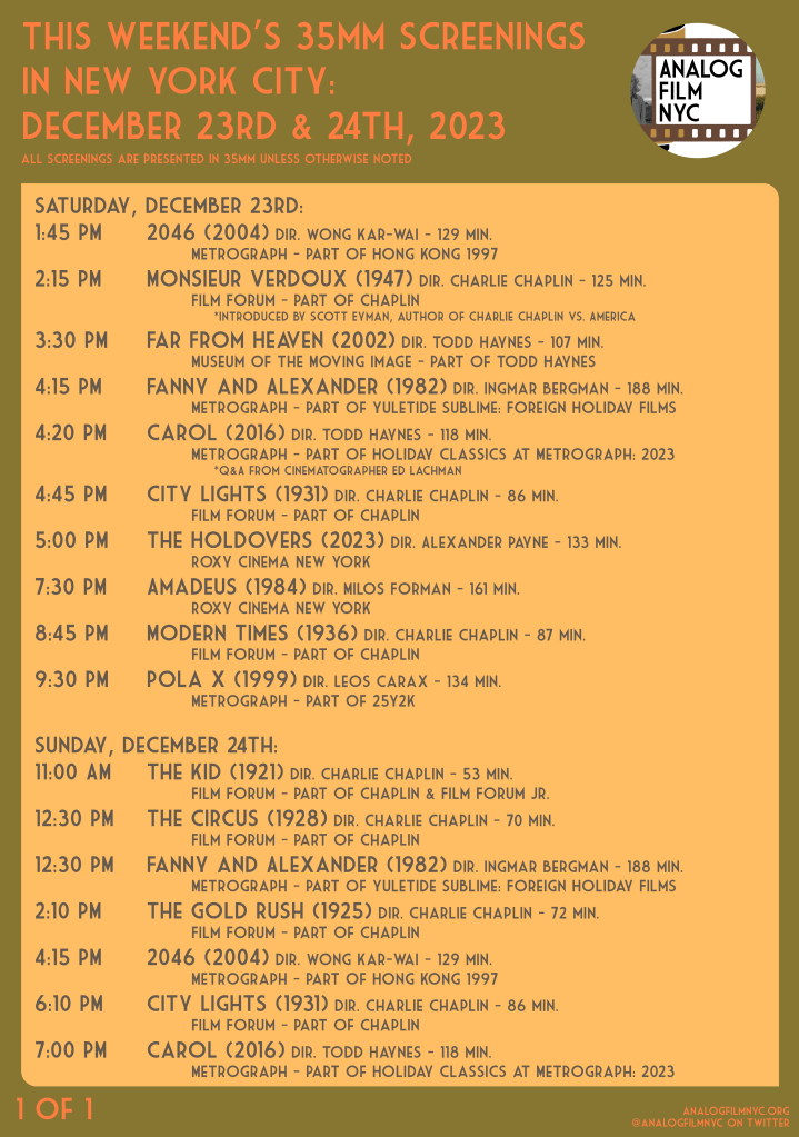Chaplin at Film Forum, The Holdovers & Amadeus at the Roxy Cinema, Todd Haynes at the Museum of the Moving Image & more.