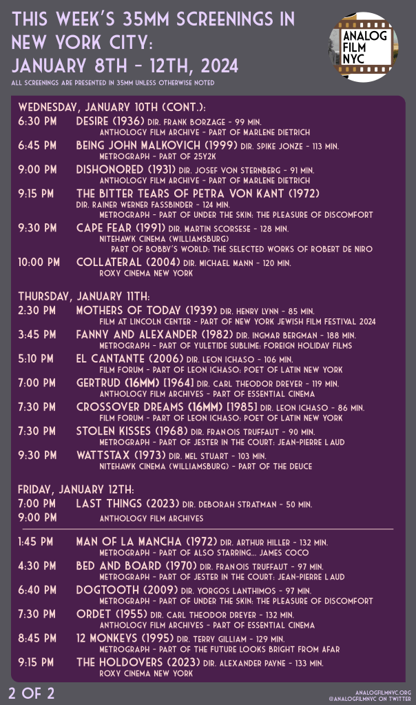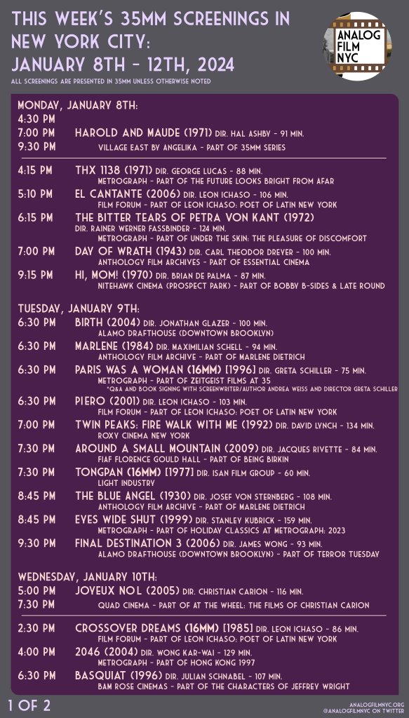 Harold and Maude at Village East by Angelika, Robert De Niro at Nitehawk Cinemas, Birth & Final Destination 3 at the Downtown Brooklyn Alamo Drafthouse, Dietrich at Anthology Film Archives, Tongpan in 16mm at Light Industry & more.