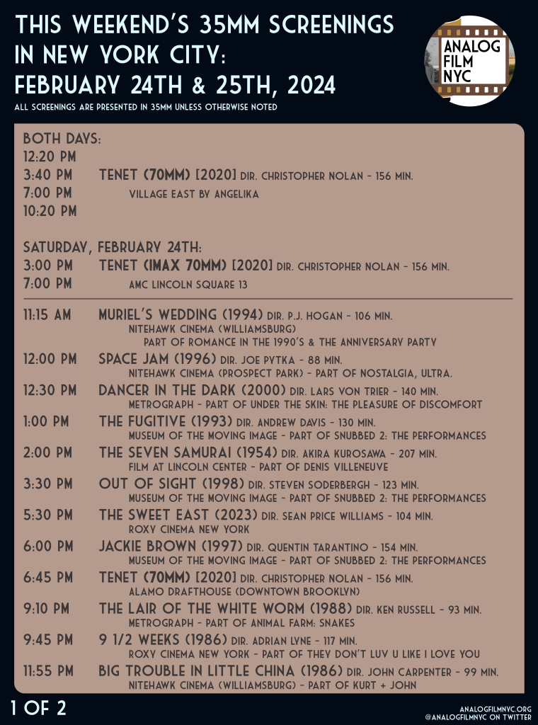 Tenet in IMAX 70mm at AMC Lincoln Square 13 & in 70mm at Village East by Angelika & the Downtown Brooklyn Alamo Drafthouse, Space Jam at Nitehawk Cinemas, Snubbed 2 at the Museum of the Moving Image & more.