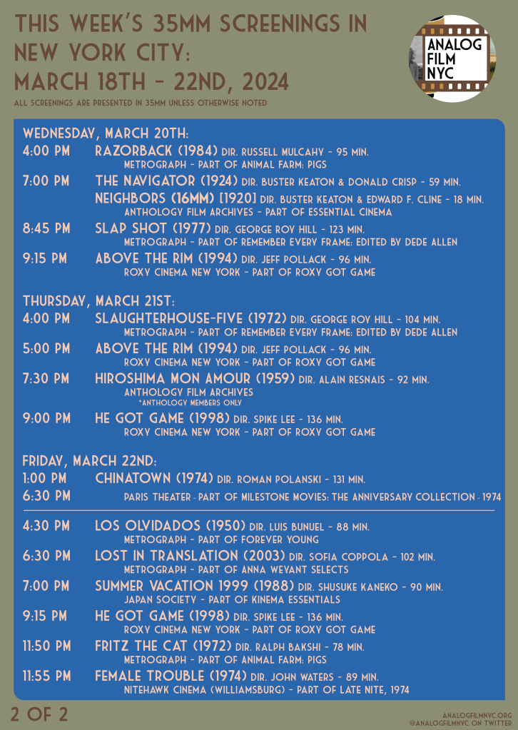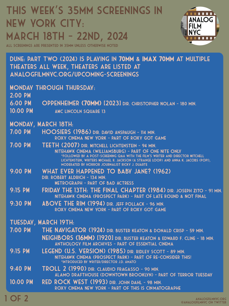 Oppenheimer in 70mm at AMC Lincoln Square 13, Roxy Got Game at the Roxy Cinema, Not Final at Nitehawk Cinemas, Buster Keaton at Anthology Film Archives, Troll 2 at the Downtown Brooklyn Alamo Drafthouse, Chinatown at the Paris Theater & more.