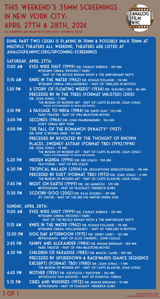 The Nicole Kidman Show & Thrillers in Motion at Nitehawk Cinemas, Joan Jonas at The Museum of Modern Art, Seconds at the Roxy Cinema, Scooby-Doo at the IFC Center, Mother (1926) at Anthology Film Archives & more.