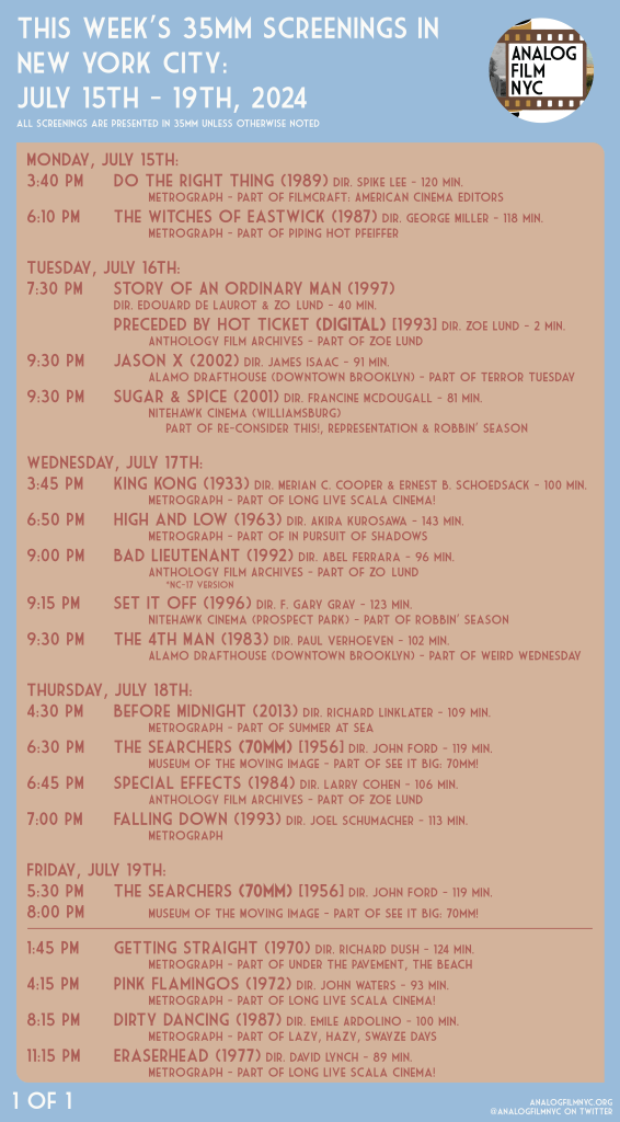 Zoë Lund at Anthology Film Archives, Robbin’ Season at Nitehawk Cinemas, Jason X & The 4th Man at the Downtown Brooklyn Alamo Drafthouse, See It Big: 70mm! at the Museum of the Moving Image & more.