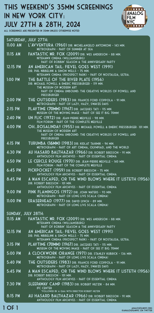 Robbin’ Season at Nitehawk Cinemas, See It Big: 70mm! at the Museum of the Moving Image, The Complete Melville at Film Forum, Bresson at Anthology Film Archives, Sleepaway Camp at the IFC Center & more.