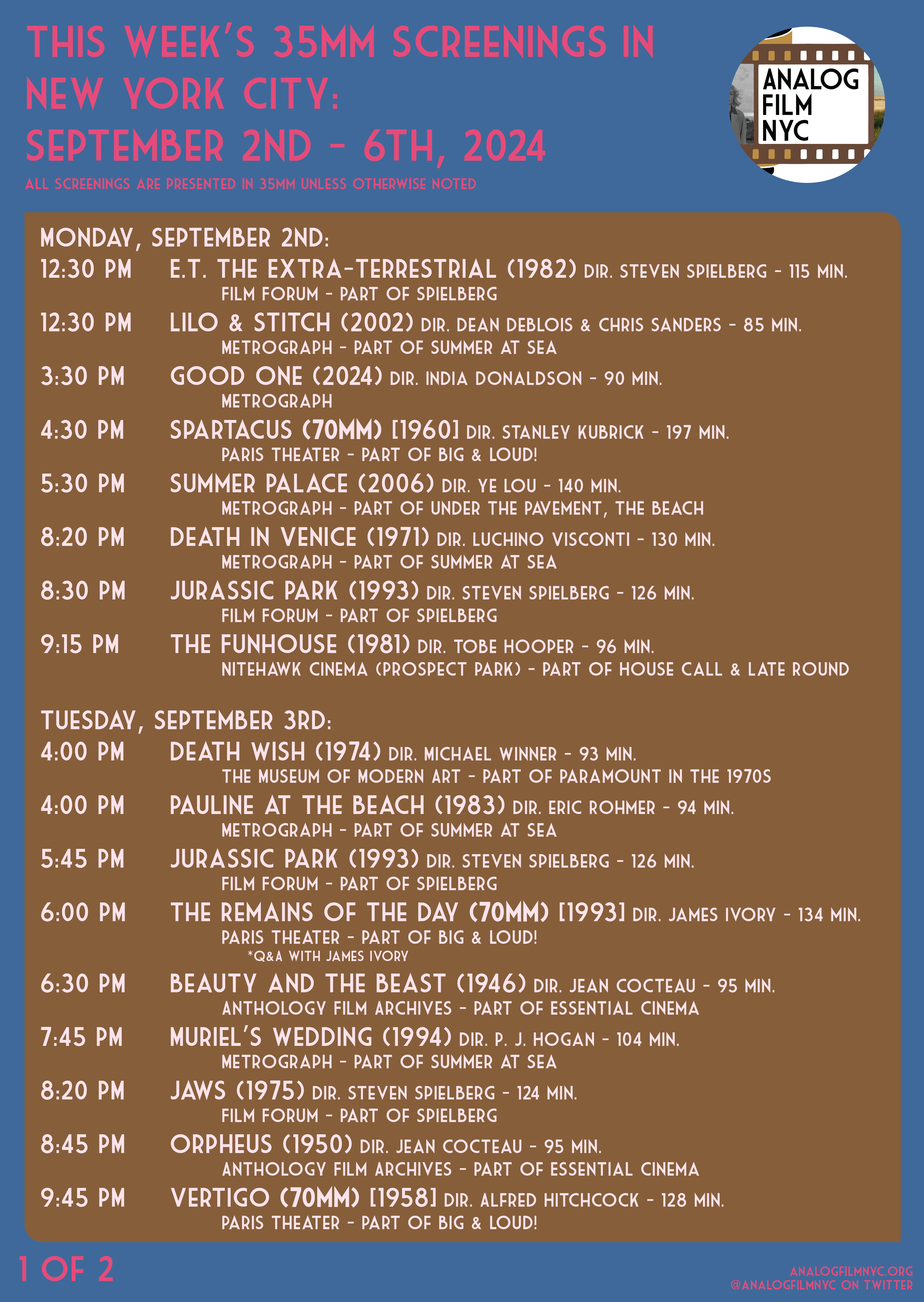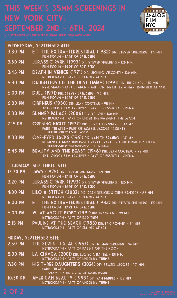 Spielberg at Film Forum, Late Round at Nitehawk Cinemas, Paramount in the 1970s at The Museum of Modern Art, Cocteau at Anthology Film Archives & more.