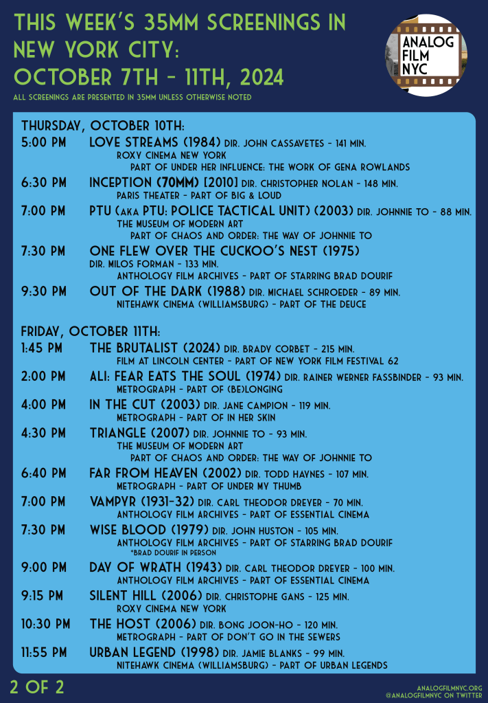 Upcoming celluloid film screenings in New York City