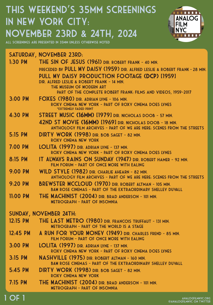 Robert Frank at The Museum of Modern Art, Lyne and Dirty Work at the Roxy Cinema, Scenes From the Streets at Anthology Film Archives, Ealing at Film Forum & more.