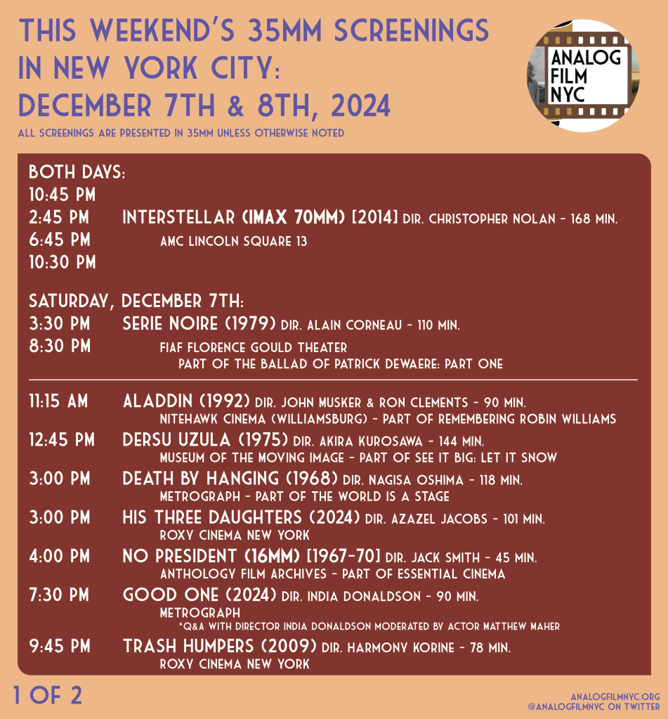 Interstellar in IMAX 70mm at AMC Lincoln Square 13, Serie Noire at L’Alliance NY, Aladdin at the Williamsburg Nitehawk Cinema, See It Big: Let It Snow at the Museum of the Moving Image, Trash Humpers at the Roxy Cinema & more.