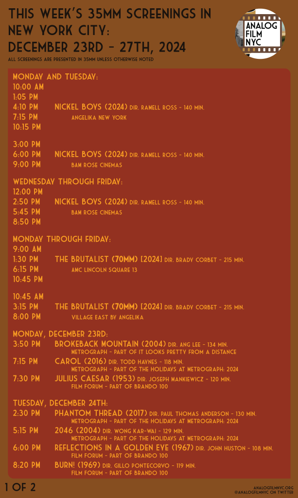 The Brutalist in 70mm at AMC Lincoln Square 13, Brando 100 & Frank Capra at Film Forum, Curators’ Choice at the Museum of the Moving Image, Minority Report at the Roxy Cinema & more.