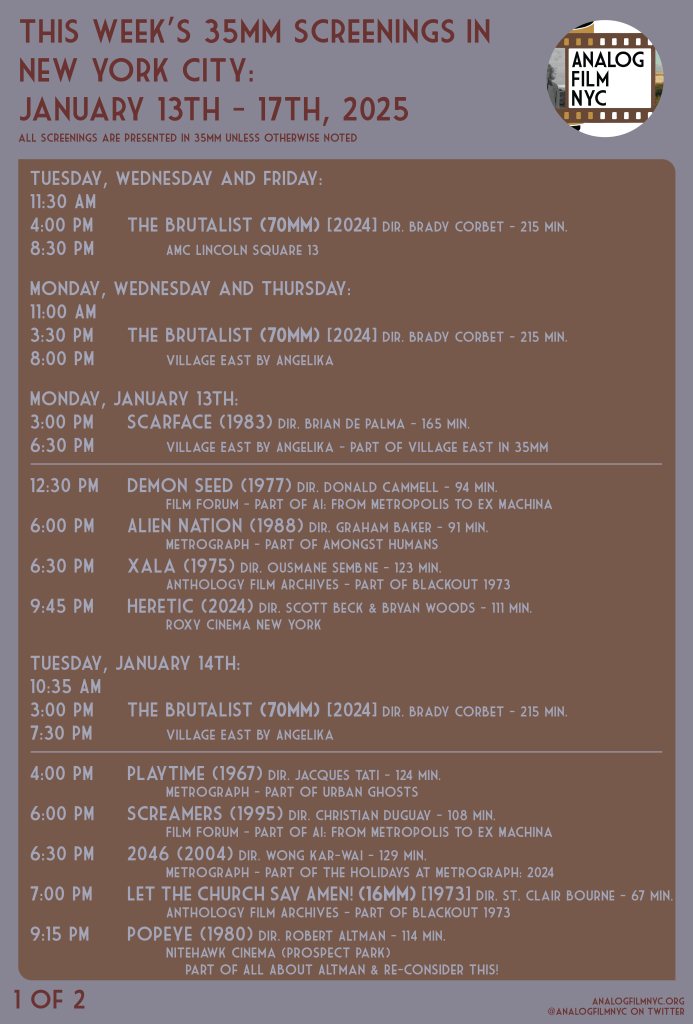 The Brutalist continues in 70mm at AMC Lincoln Square 13, Scarface at Village East by Angelika, AI at Film Forum, Blackout 1973 at Anthology Film Archives, Heretic & Queer at the Roxy Cinema & more.