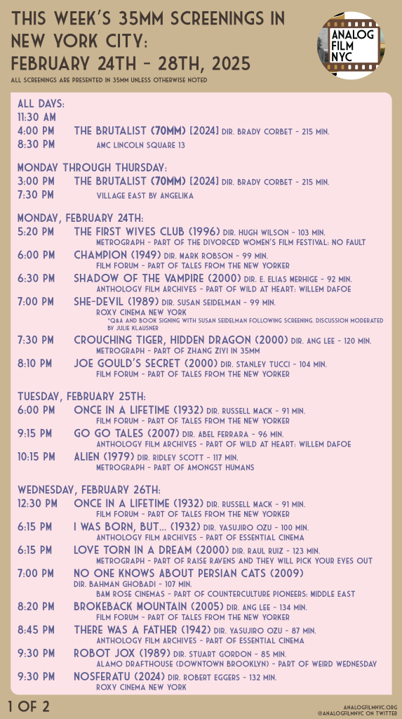 Oppenheimer returns in IMAX 70mm at AMC Lincoln Square 13, Tales From The New Yorker at Film Forum, Willem Dafoe & Ozu at Anthology Film Archives, She-Devil & Nosferatu at the Roxy Cinema & more.