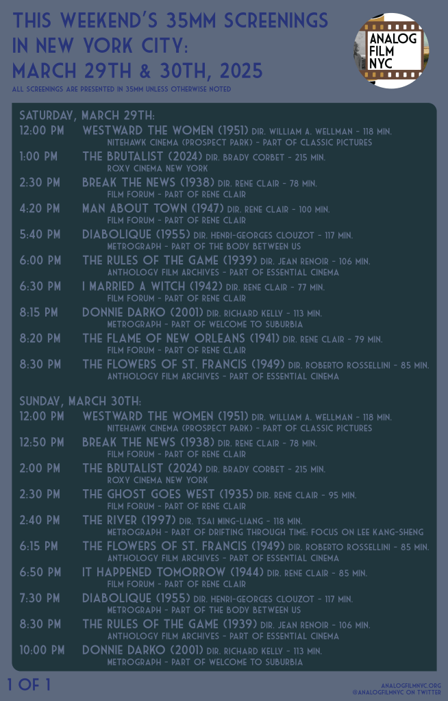 The Brutalist at the Roxy Cinema, Rene Clair at Film Forum, Rossellini & Renoir at Anthology Film Archives, Classic Pictures at Nitehawk Cinemas & more.