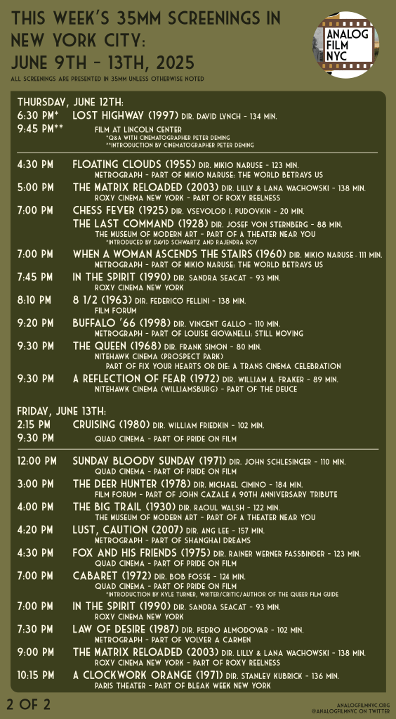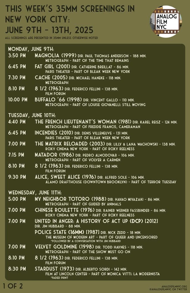 8 1/2 at Film Forum, Roxy Reelness at the Roxy Cinema New York, Monica Vitti & Lost Highway at Film at Lincoln Center, Queer and Uncensored at The Museum of Modern Art & more.