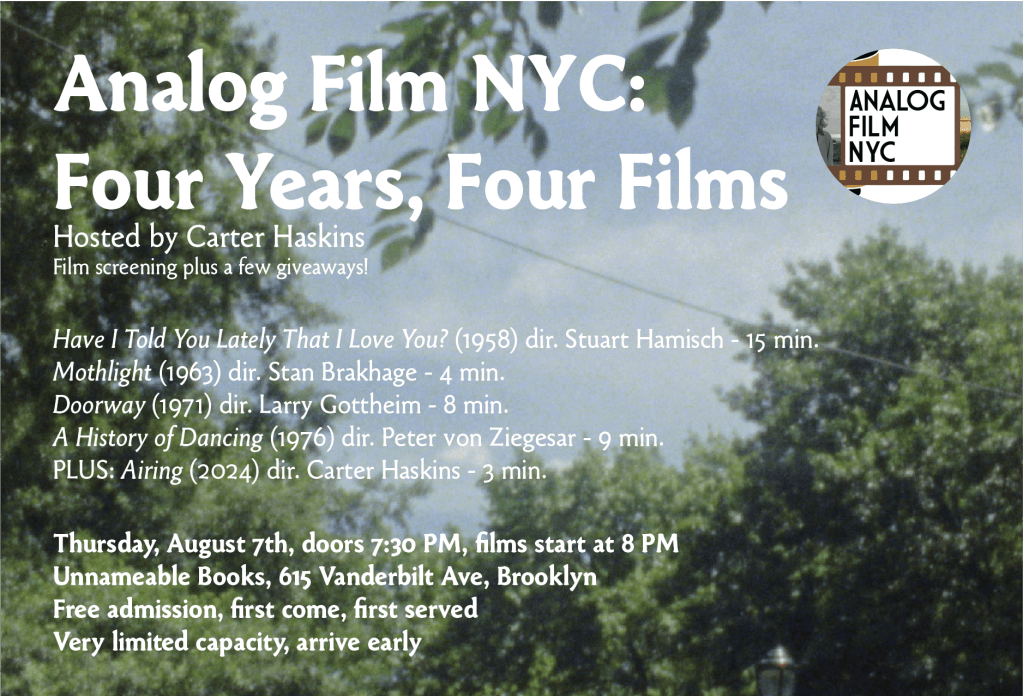 Join me for a celebration of the fourth anniversary of the creation of Analog Film NYC featuring four 16mm prints from my personal collection and a few giveaways! PLUS the premiere of a newly struck 16mm print of my 2024 film Airing!