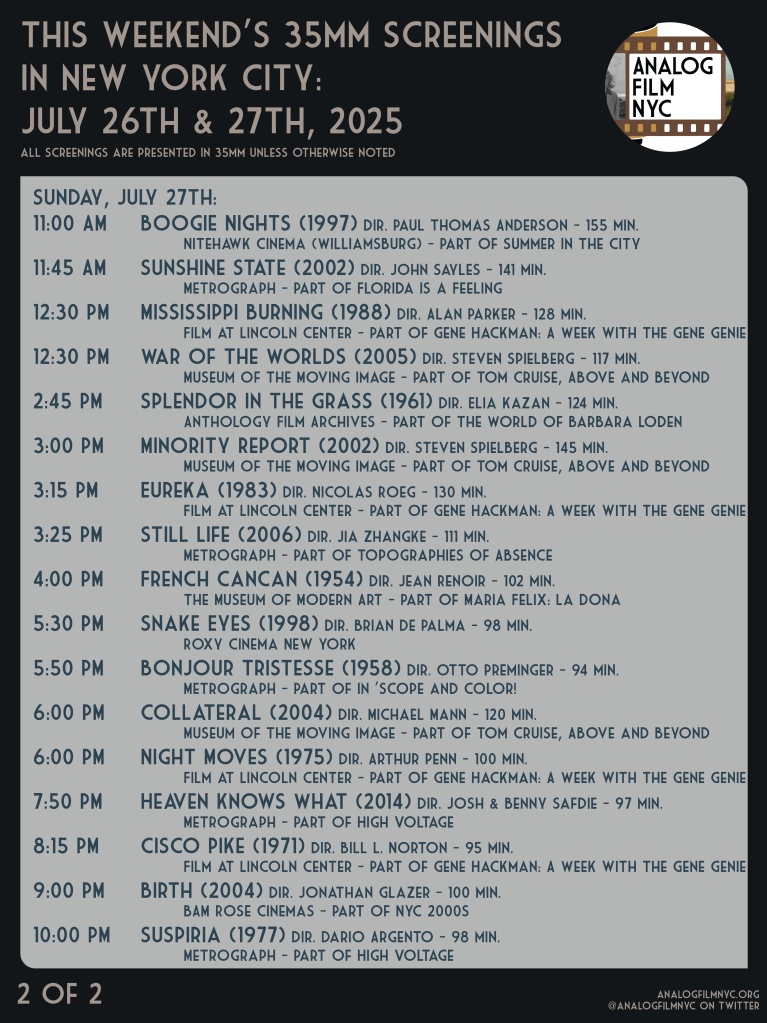 Summer in the City at Nitehawk Cinemas, Gene Hackman at Film at Lincoln Center, Snake Eyes & Breathless (1983) at the Roxy Cinema, Tom Cruise at the Museum of the Moving Image & more.