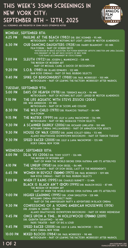 Screen Deco at Film Forum, Animation for Adults at Nitehawk Cinemas, Hurricane Katrina & Michael Caine at The Museum of Modern Art, Speed Racer at the Roxy CinemaNYC & more.