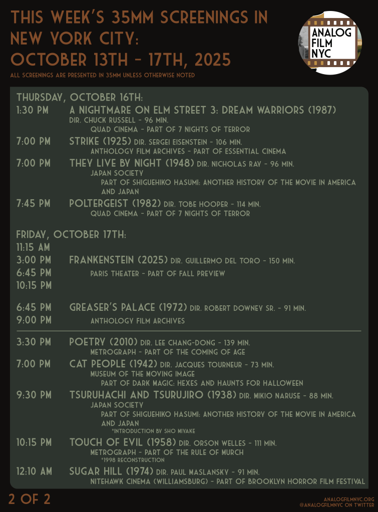 Guillermo Del Toro’s Frankenstein at the Paris Theater, 7 Nights of Terror at the Quad Cinema, Final Girls at Nitehawk Cinemas, Eisenstein at Anthology Film Archives & more.