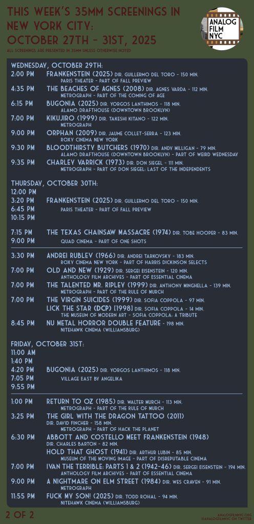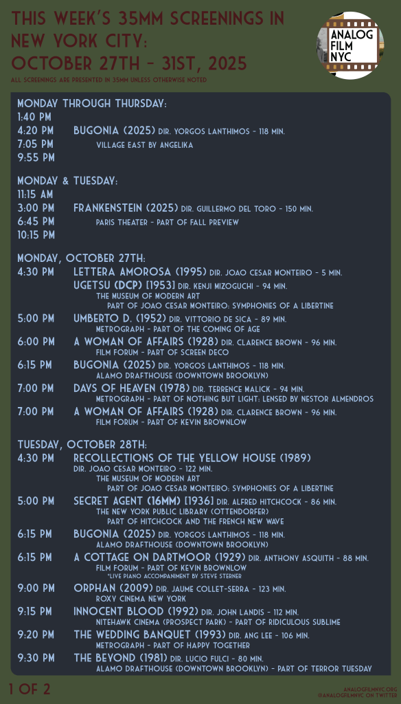 Bugonia at Village East by Angelika, Monteiro at The Museum of Modern Art, Kevin Brownlow at Film Forum, Orphan at the Roxy Cinema, The Texas Chainsaw Massacre at the Quad Cinema & more.