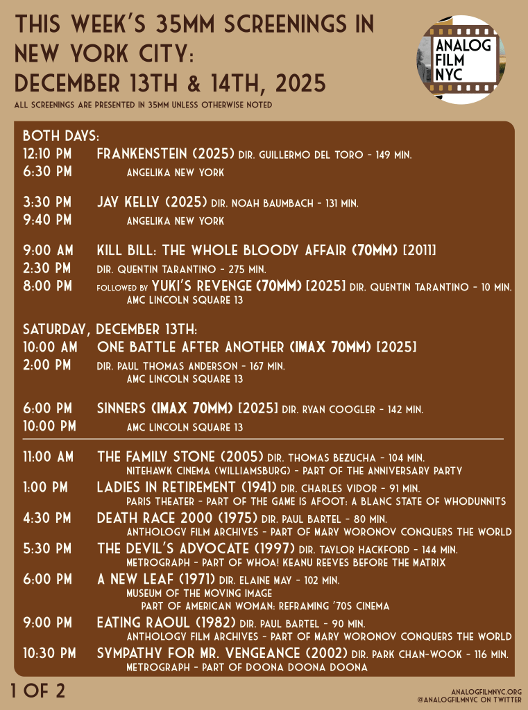 Frankenstein & Jay Kelly continue at Angelika New York, One Battle After Another & Sinners return in IMAX 70mm at AMC Lincoln Square, American Woman at the Museum of the Moving Image, & more.