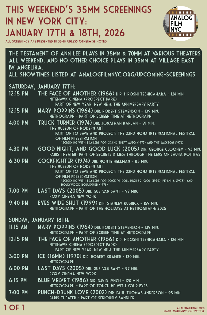 To Save and Project at The Museum of Modern Art, Gus Van Sant at the Roxy Cinema, New Year, New Me at Nitehawk Cinemas, and more.