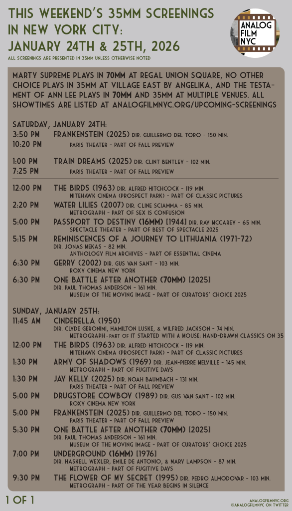 The Birds at Nitehawk Cinemas, Passport to Destiny in 16mm at Spectacle, Jonas Mekas at Anthology Film Archives, One Battle After Another in 70mm at the Museum of the Moving Image, Gus Van Sant at the Roxy Cinema, and more.