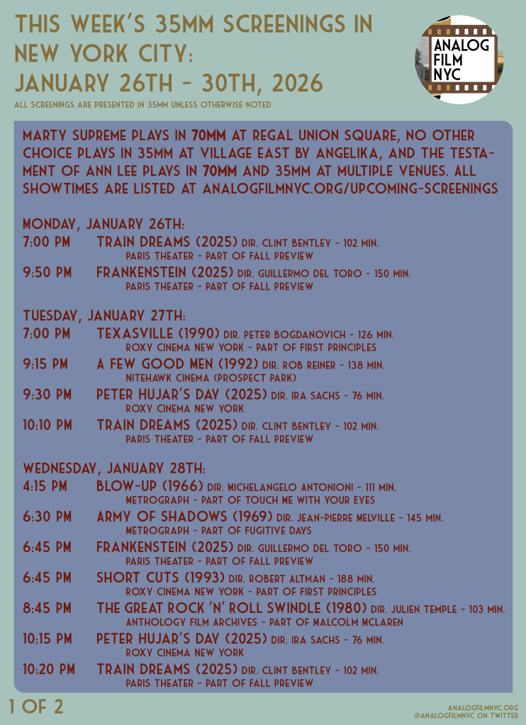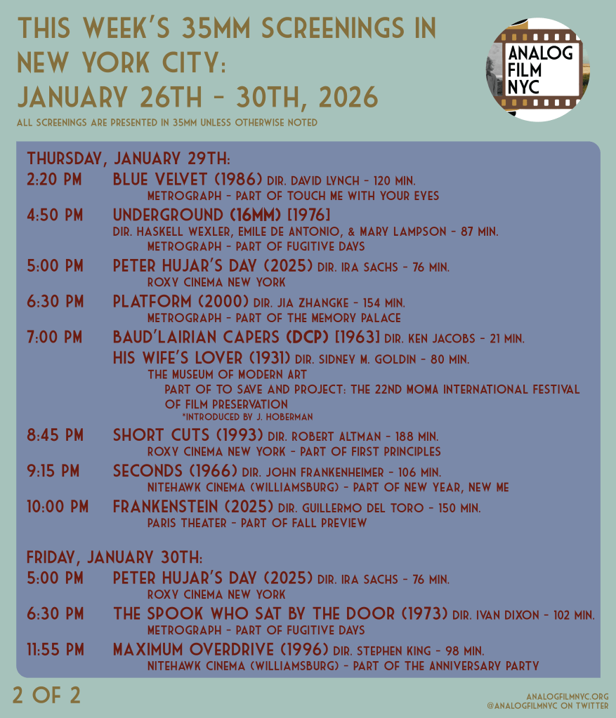 Fall Films at the Paris Theater, First Principles & Peter Hujar’s Day at the Roxy Cinema, To Save and Project at The Museum of Modern Art, Maximum Overdrive at Nitehawk Cinemas, and more.