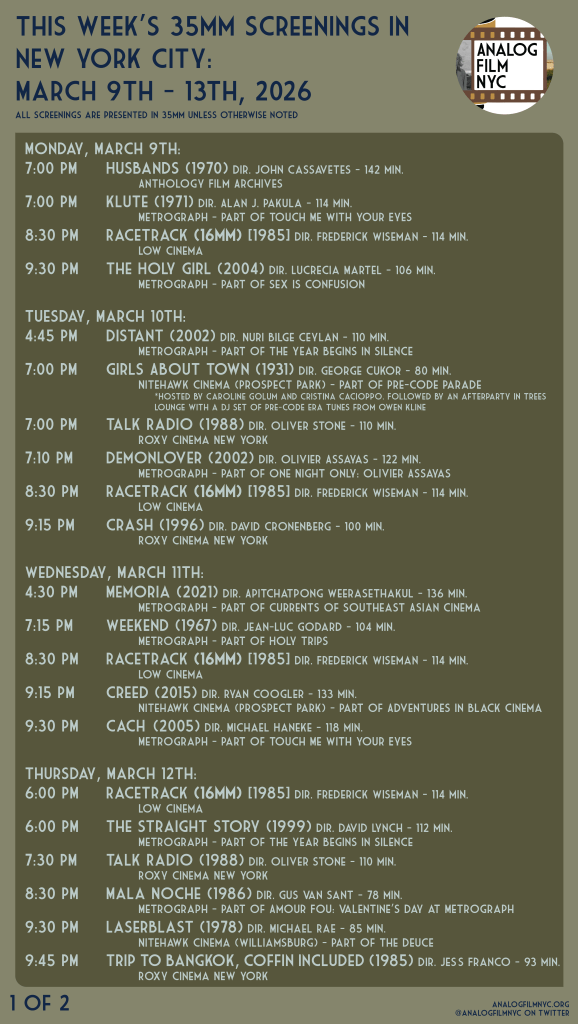 Husbands at Anthology Film Archives, Racetrack in 16mm at Low Cinema, Talk Radio & Crash at the Roxy Cinema, The Revolution Will Not Be Televised at Village East by Angelika, and more.